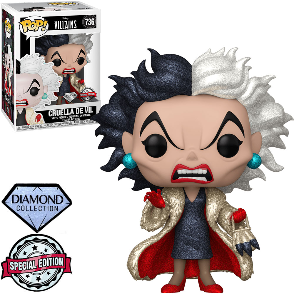Uma das maiores vilões da Disney, Cruella De Vil é uma personalidade da moda extremamente rica, que sonha em usar a pele de vários filhotes de dálmatas para fazer casacos de pele.